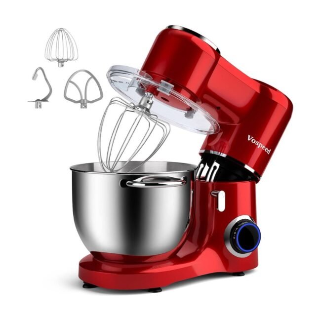 The vibrant red finish and durable construction make the Vospeed Stand Mixer both an attractive and practical tool for any kitchen. Whether you’re mixing batters, kneading dough, or whipping cream, this stand mixer provides consistent and professional results.
